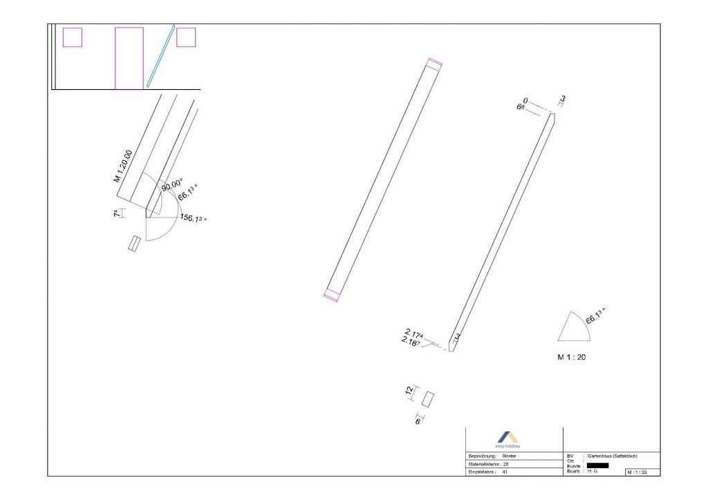 Solltest Du Dich zu einer Zusammenarbeit mit mir entschließen erläutere ich Dir nun anhand einer Strebe für das oben abgebildete Gartenhaus welche Dokumente Du für die Ausführung Deines Projektes von mir erhältst. Nach der Nummerierung auf den Plänen und der Materialliste kannst Du jedes Holz einwandfrei bestimmen, siehst wo in der Wand oder dem Dach das Holz verbaut wird und in der Einzelzeichnung siehst Du wie Du es anzeichnen und ausarbeiten musst um ein passgenaues Holz für Deine Konstruktion zu erhalten.