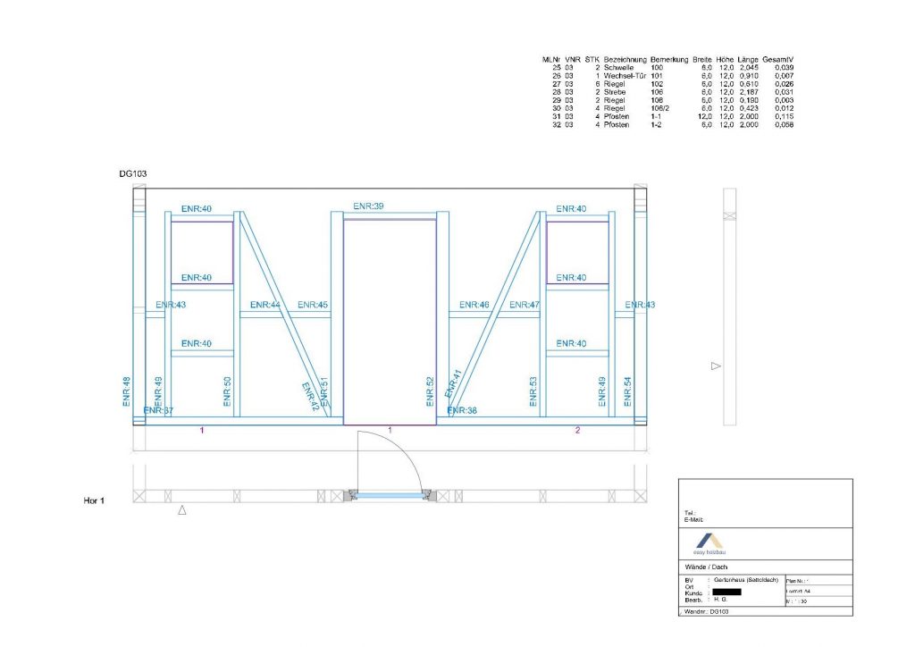 Damit Du genau weißt wo das jeweilige Holz in der Wand verbaut ist sind die Hölzer anhand der EZNr. zu identifizieren und Du kannst sehen wo dieses Holz eingebaut ist. Für unser Beispiel betrachten wir nun Die Wand Nummer DG103 und in dieser die Strebe mit der EZNr. 41, diese hast Du sicher schon in der Materialliste entdecken können. Da die Streben mit der EZNr. 41 und 42 gleich lang sind tauchen die aus Übersichtlichkeitsgründen in der Bestelliste nur als eine Position auf, dies verhält sich bei allen anderen Hölzern genauso.